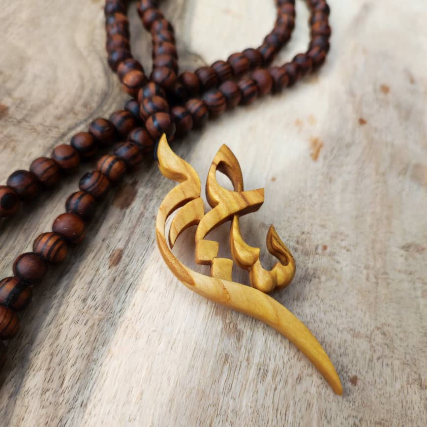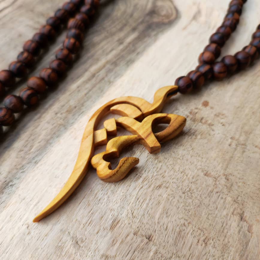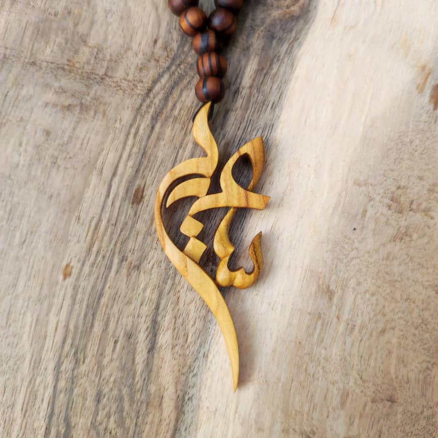 گردنبند چوبی دستساز ساخته شده از چوب زردآلو و مهره چوب زیتون قابل سفارش در اسم دلخواه.