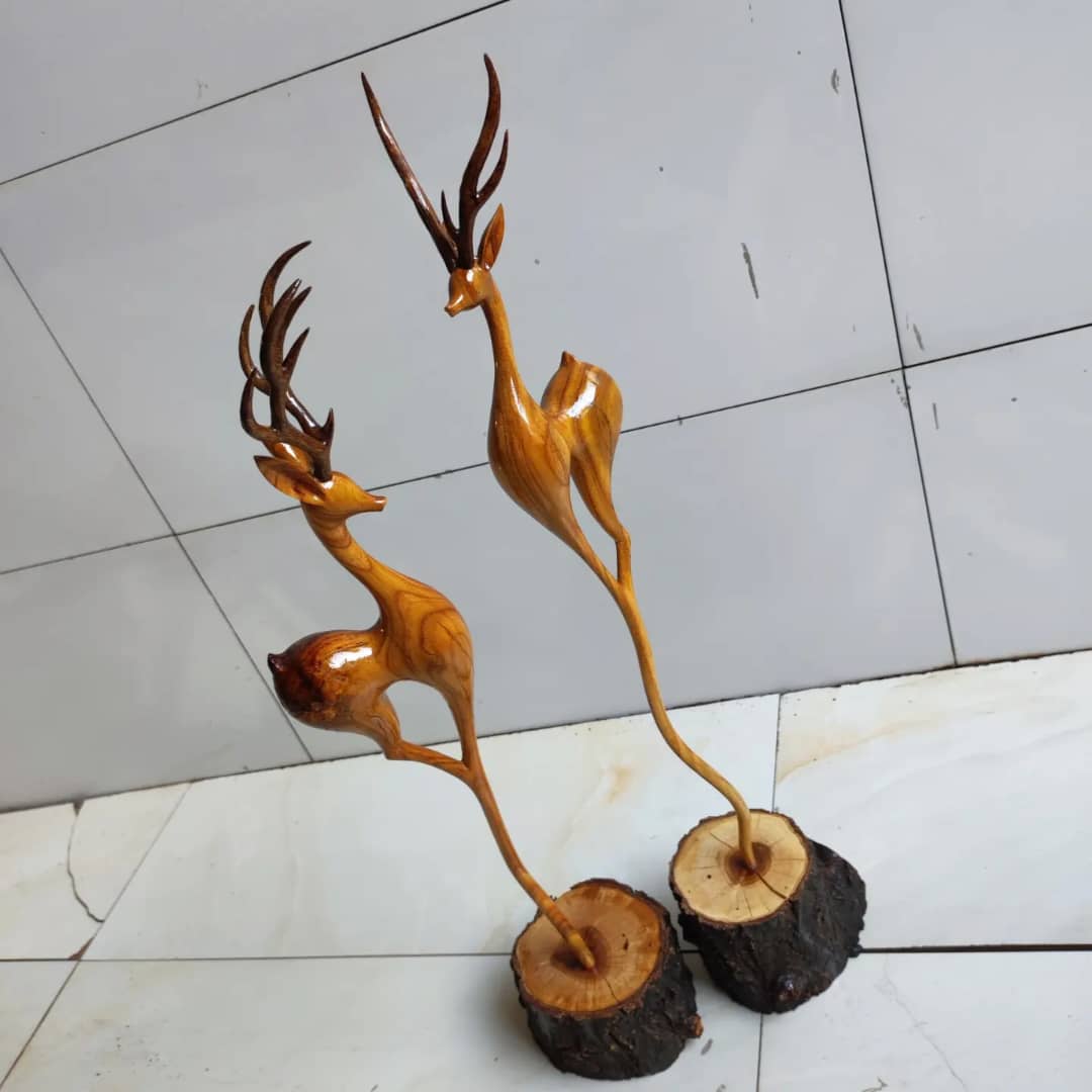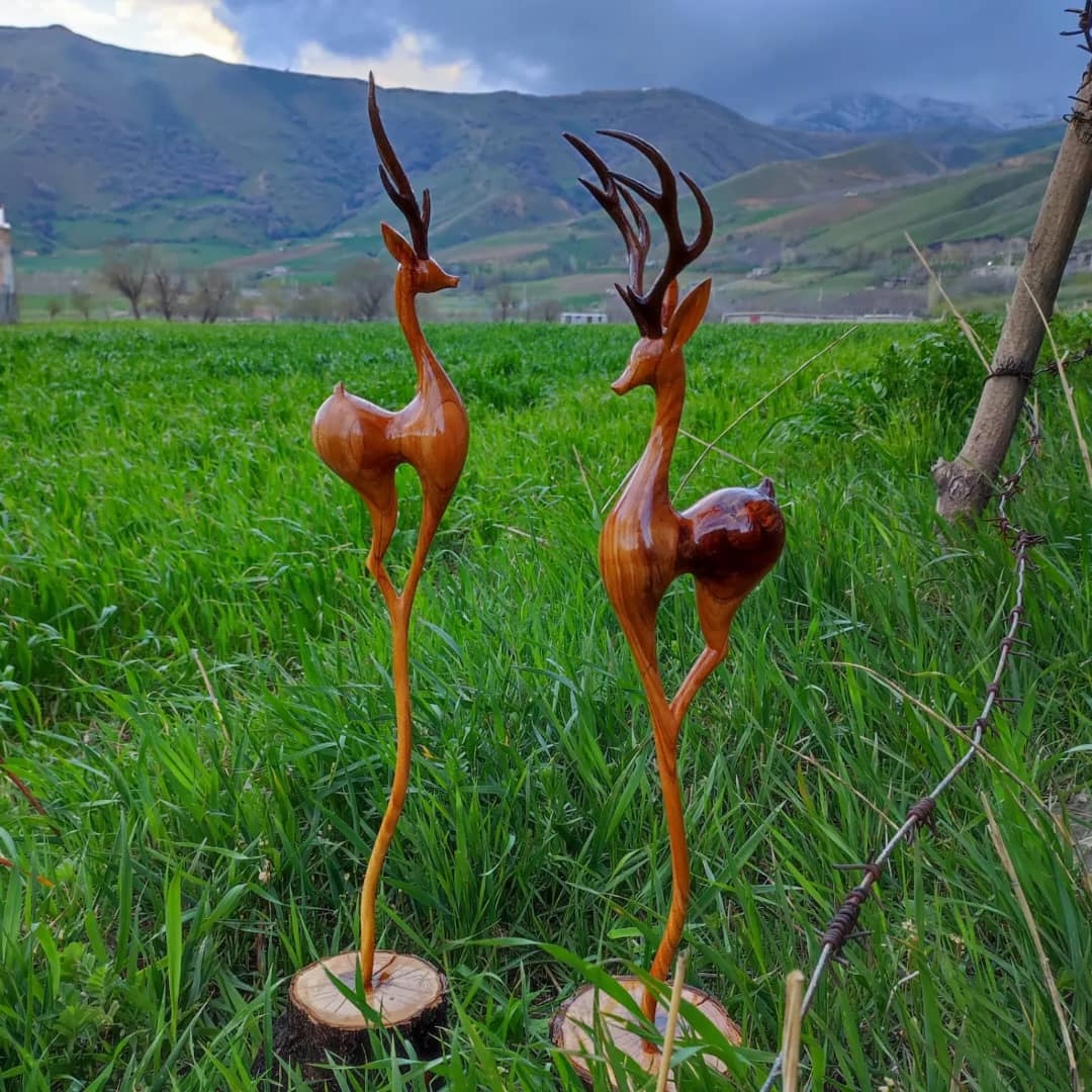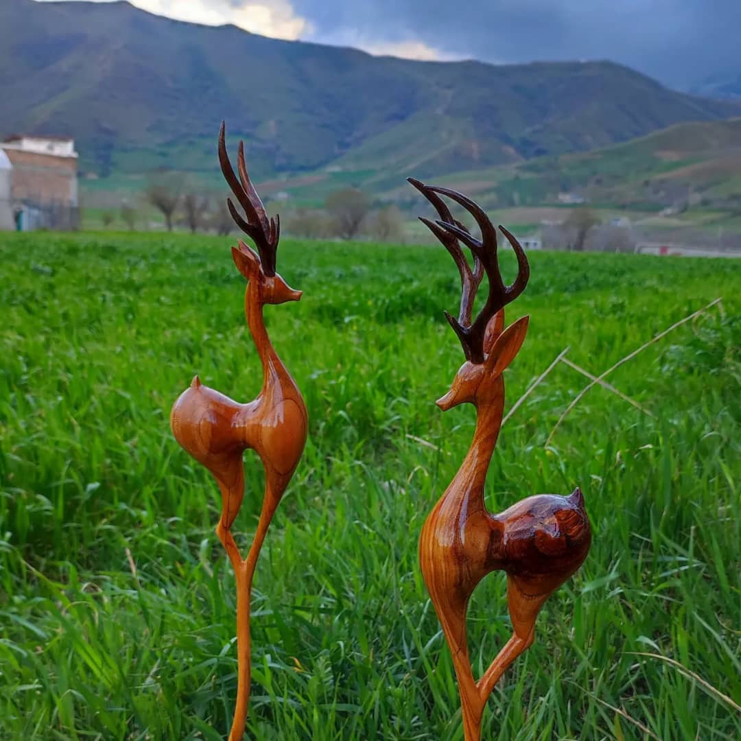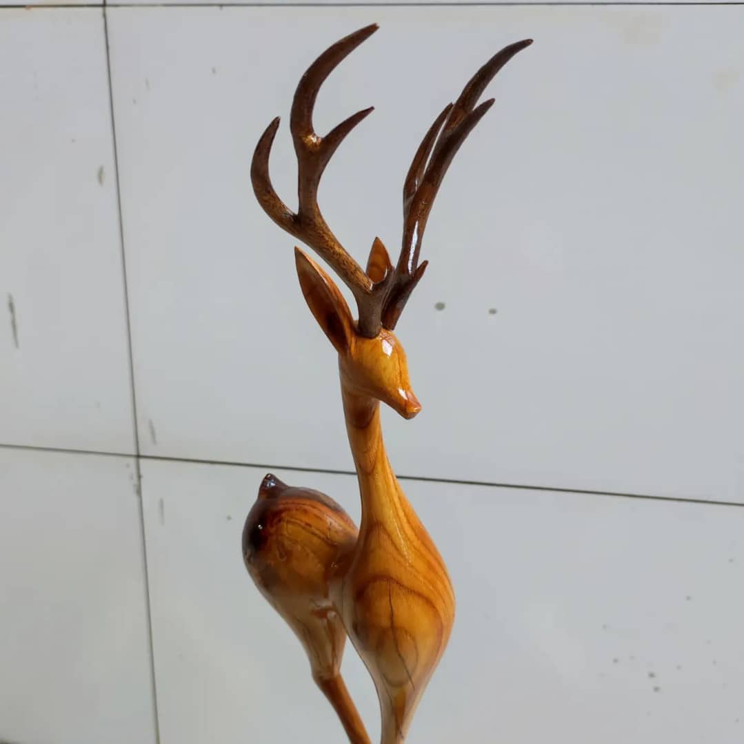 غزال چوبی دستساز ساخته شده با چوب زرد آلو و شاخ های چوب گردو