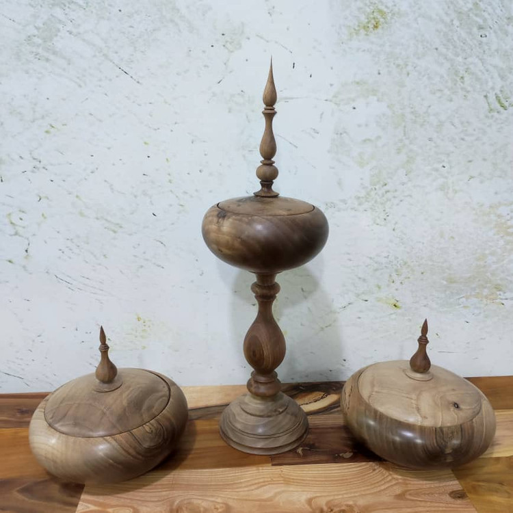 سرویس پذیرایی سه تیکه شامل یک شکلات خوری پایه دار و دوتا بدون پایه ساخته شده از چوب گردو و اعمال روغن گیاهی بدون بدو آبگریز و قابل نظافت به عنوان پوشش کار