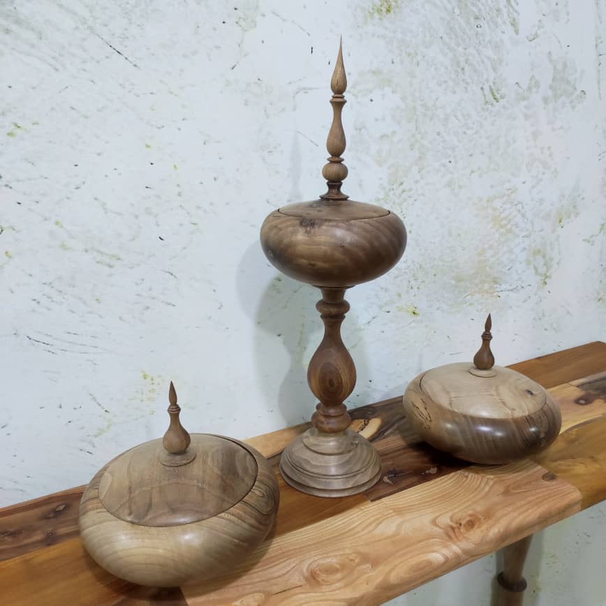 سرویس پذیرایی سه تیکه شامل یک شکلات خوری پایه دار و دوتا بدون پایه ساخته شده از چوب گردو و اعمال روغن گیاهی بدون بدو آبگریز و قابل نظافت به عنوان پوشش کار