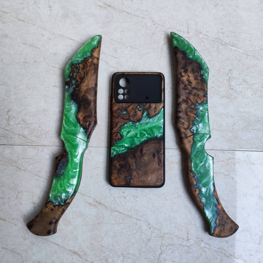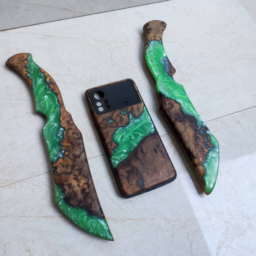ست چاقو و کاور گوشی تلفیق چوب و رزین