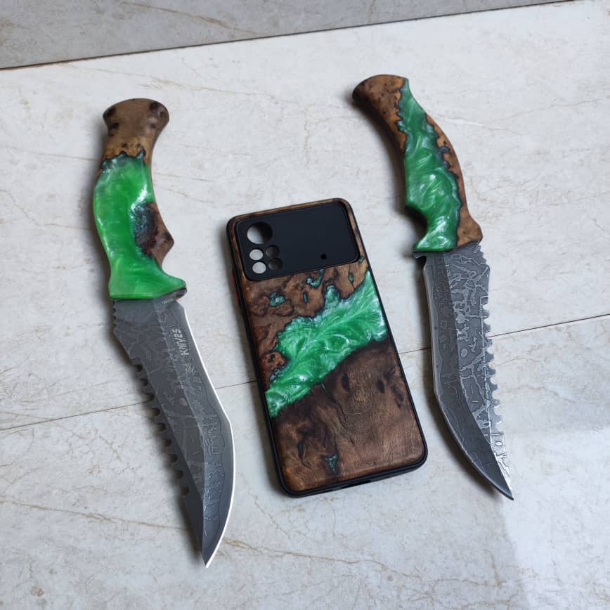 ست فوقالعاده جذاب و خفن چاقو شکاری و کاور گوشی تماماً دست ساز و فوق العاده باکیفیت تلفیق چوب ریشه گردو و رزین اپوکسی
