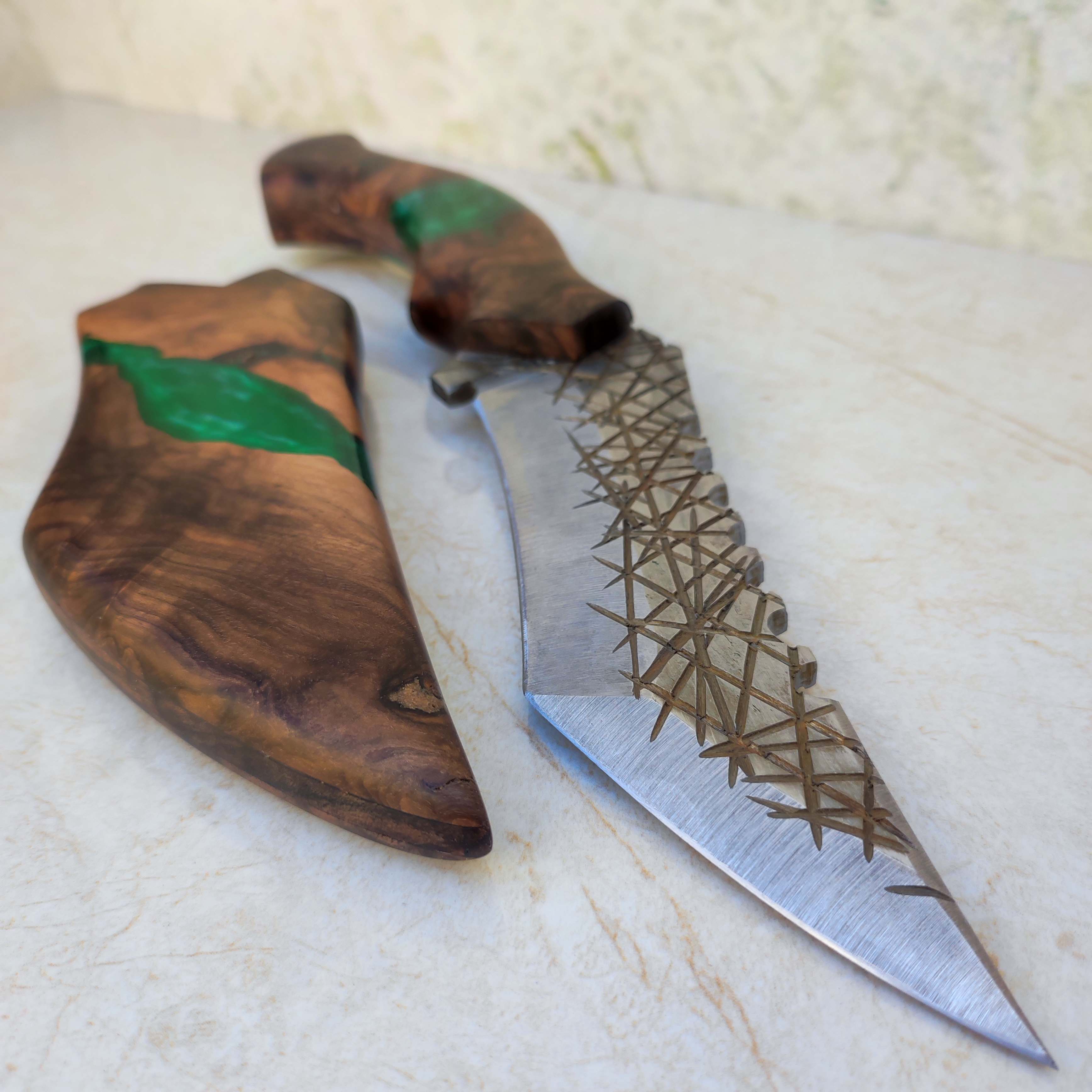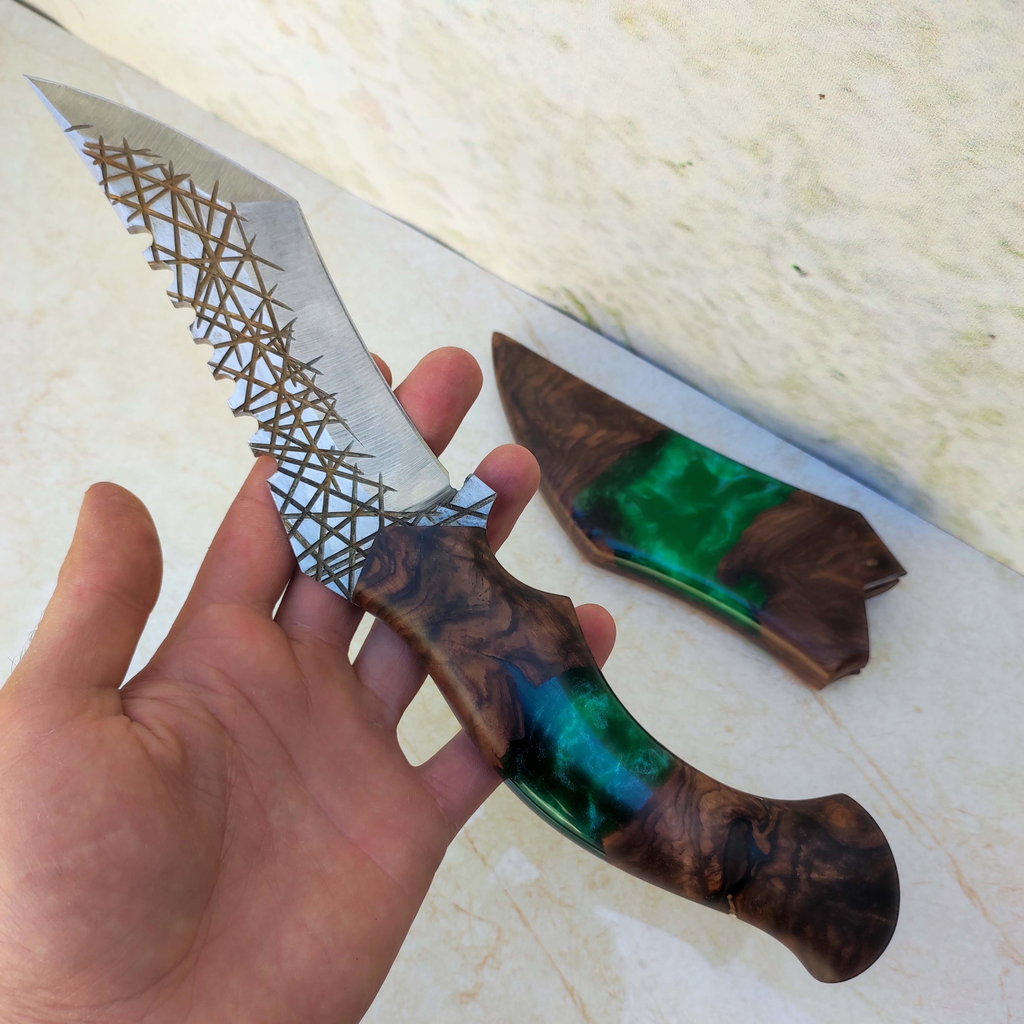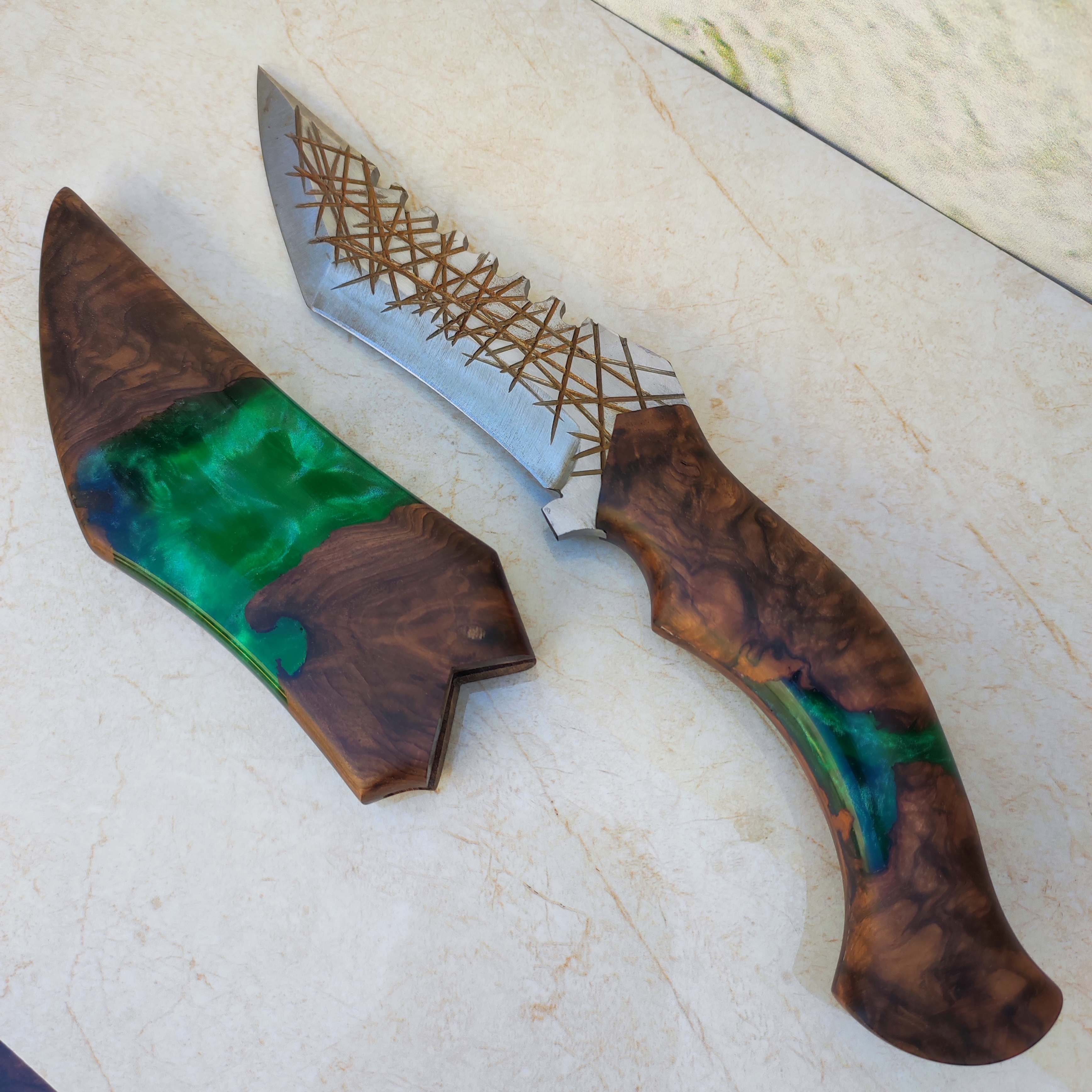 دسته و غلاف چاقو از چوب بسیار زیبای ریشه گردو تیره جنگلی با تلفیق رزین اپوکسی سبز صدفی ساخته شده.