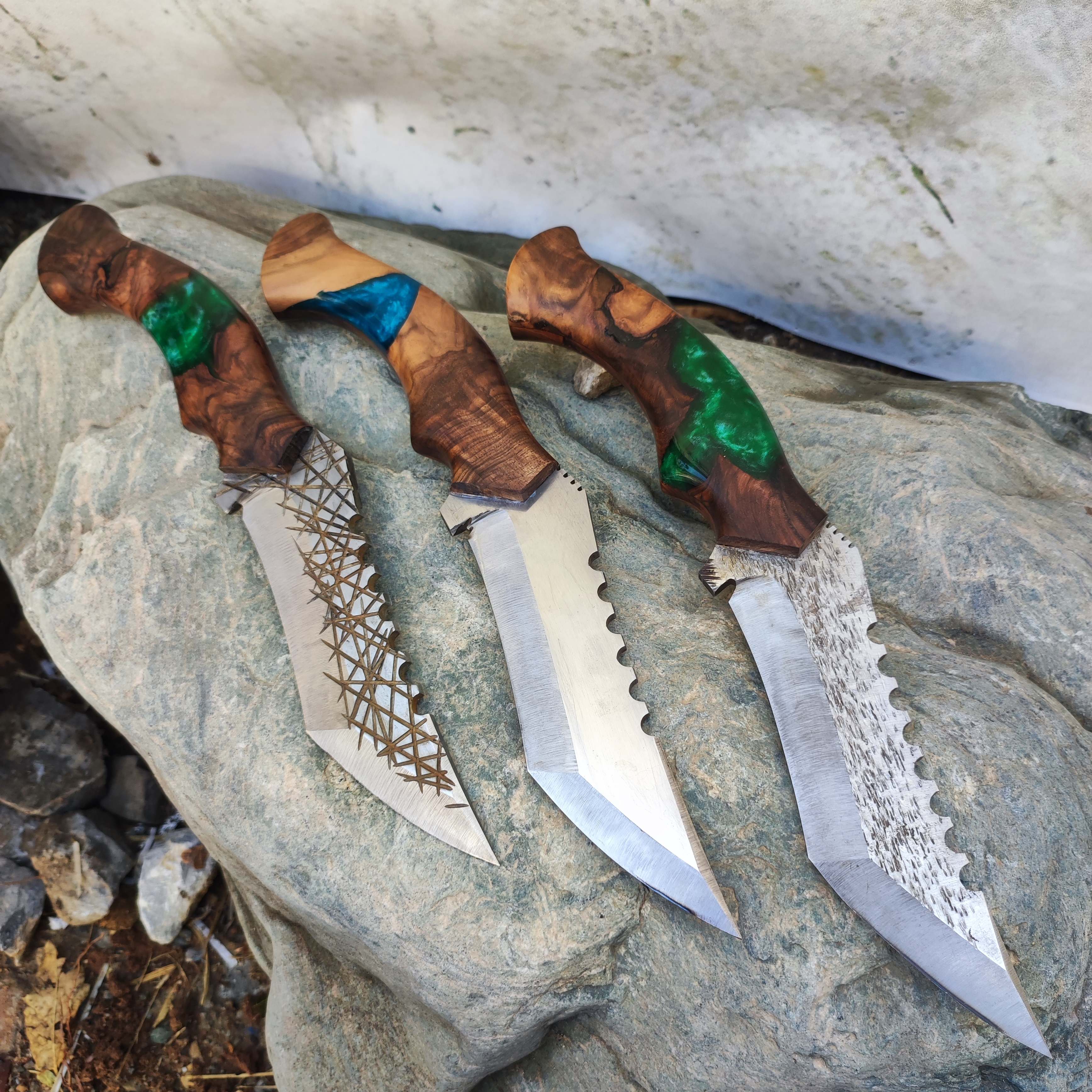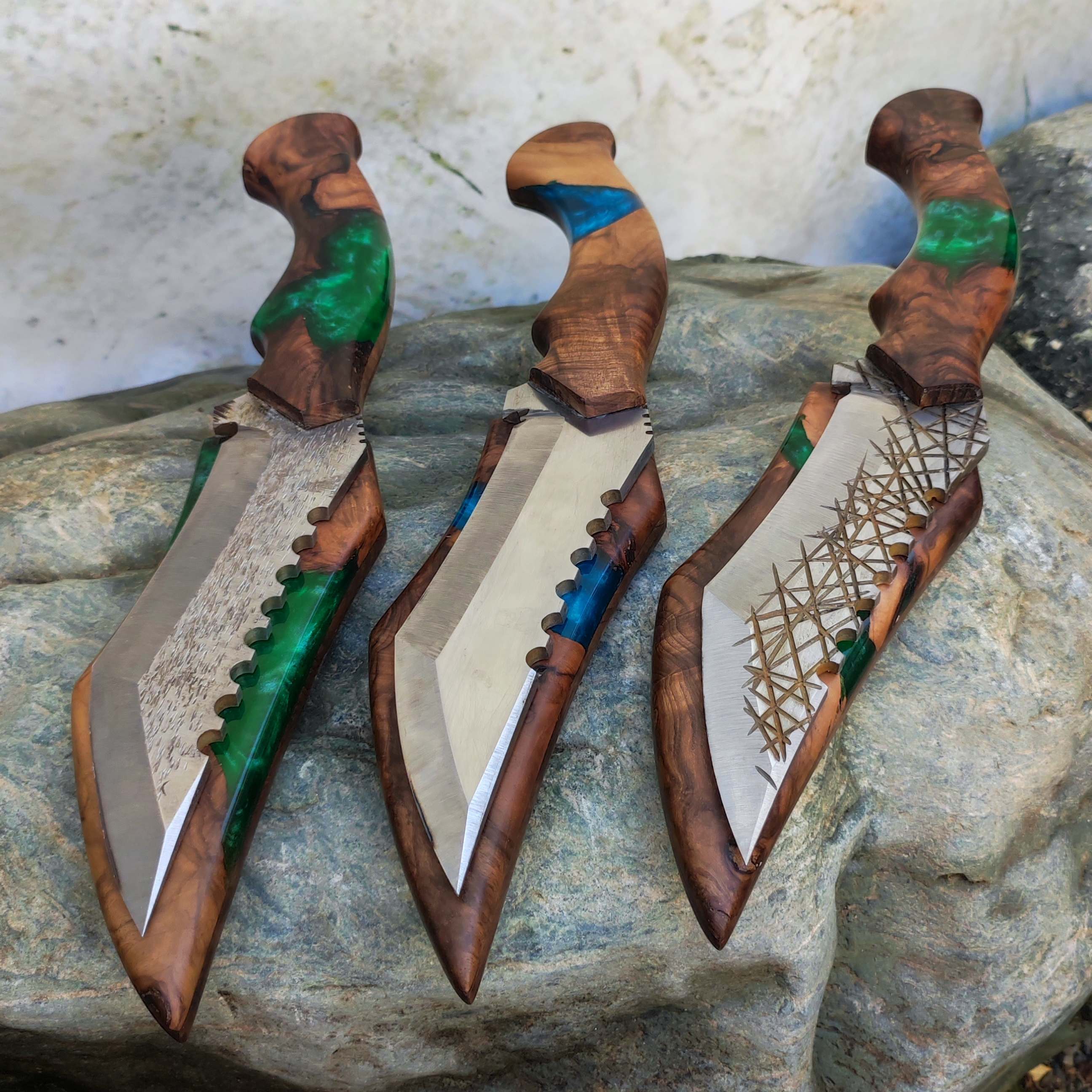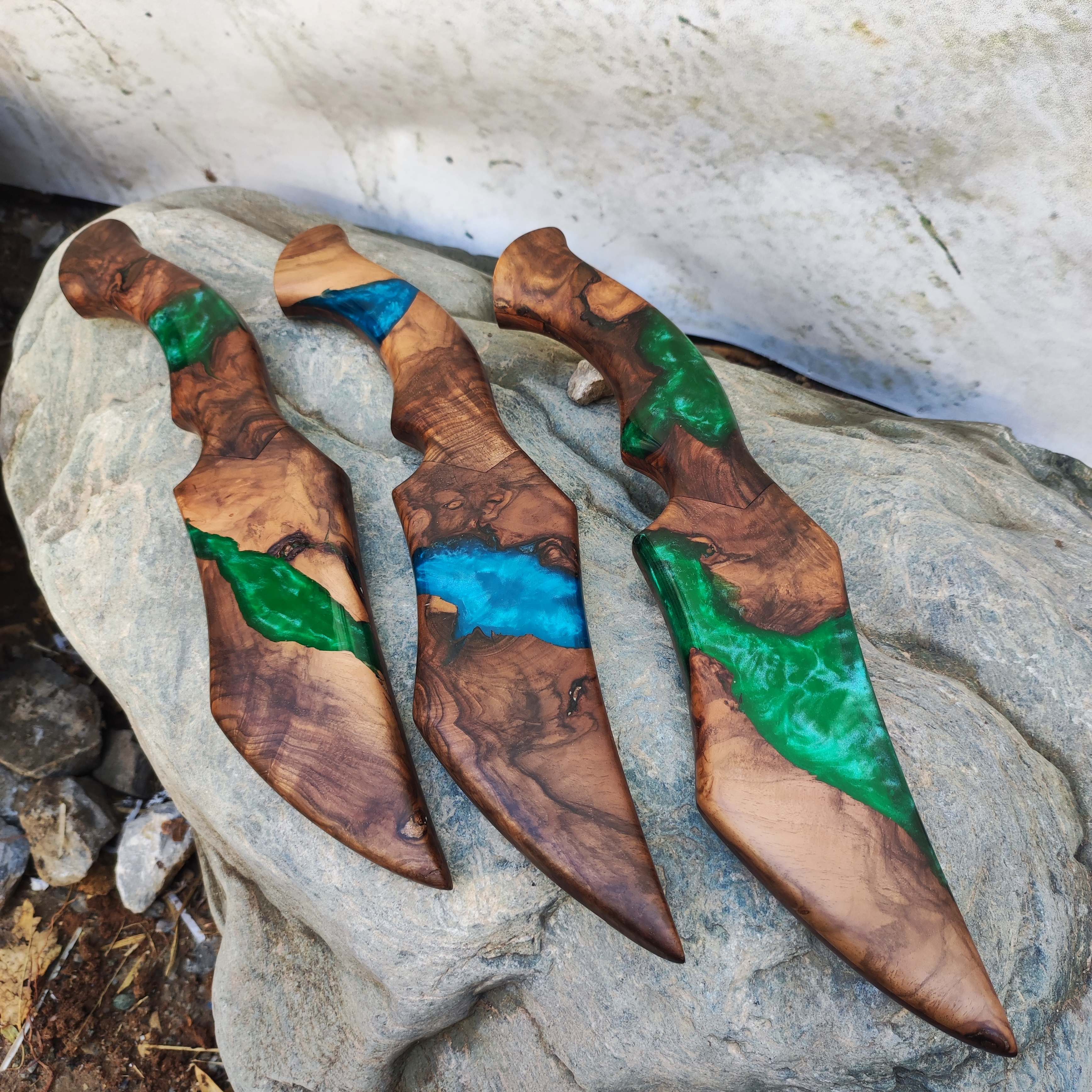 دسته و غلاف چاقو از چوب بسیار زیبای ریشه گردو تیره جنگلی با تلفیق رزین اپوکسی سبز صدفی ساخته شده.