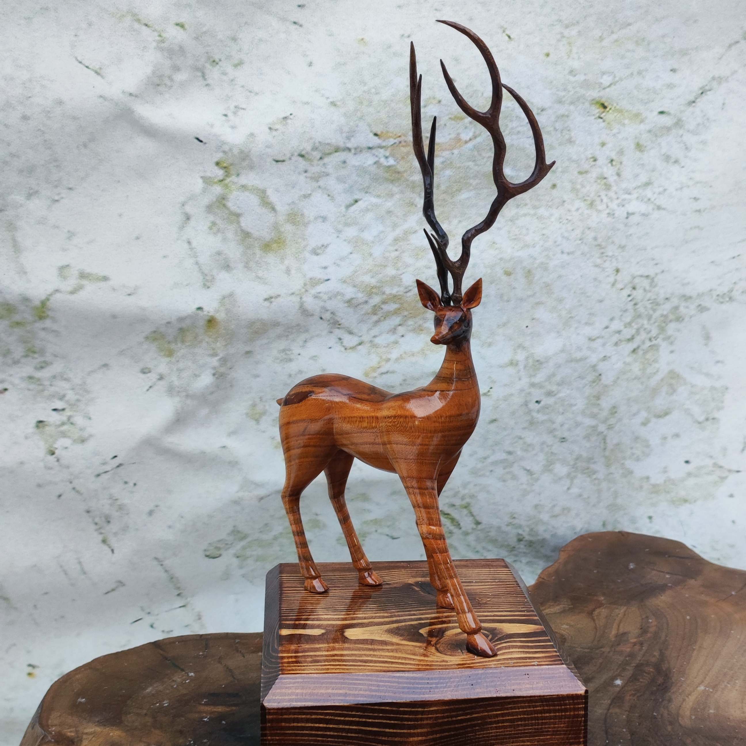 مجسمه چوبی غزال شاخ دار ساخته شده از چوب درخت زردآلو و شاخ های آن از درخت گردو تماماً دستساز یک دکوری خاص برای منزل و میز کار
