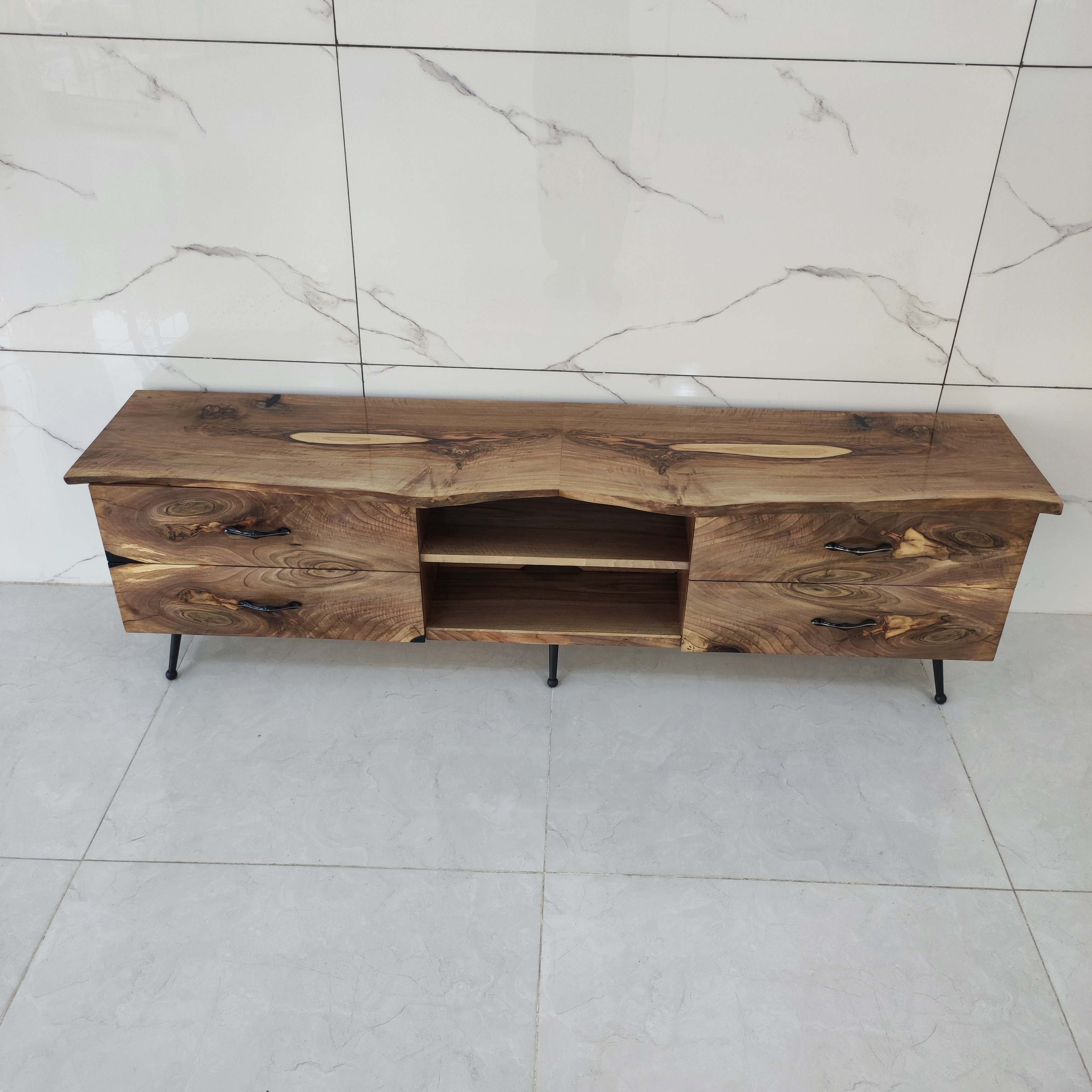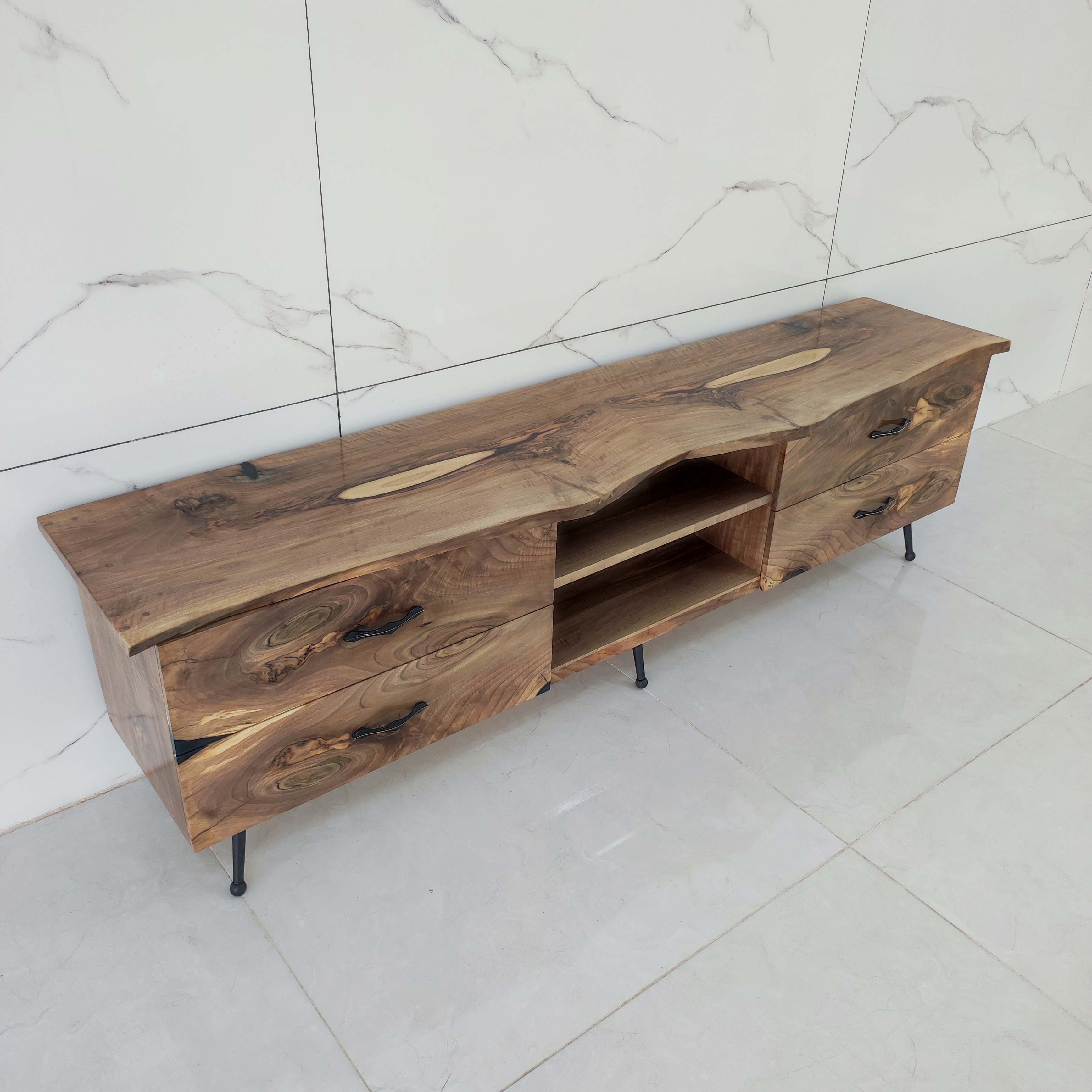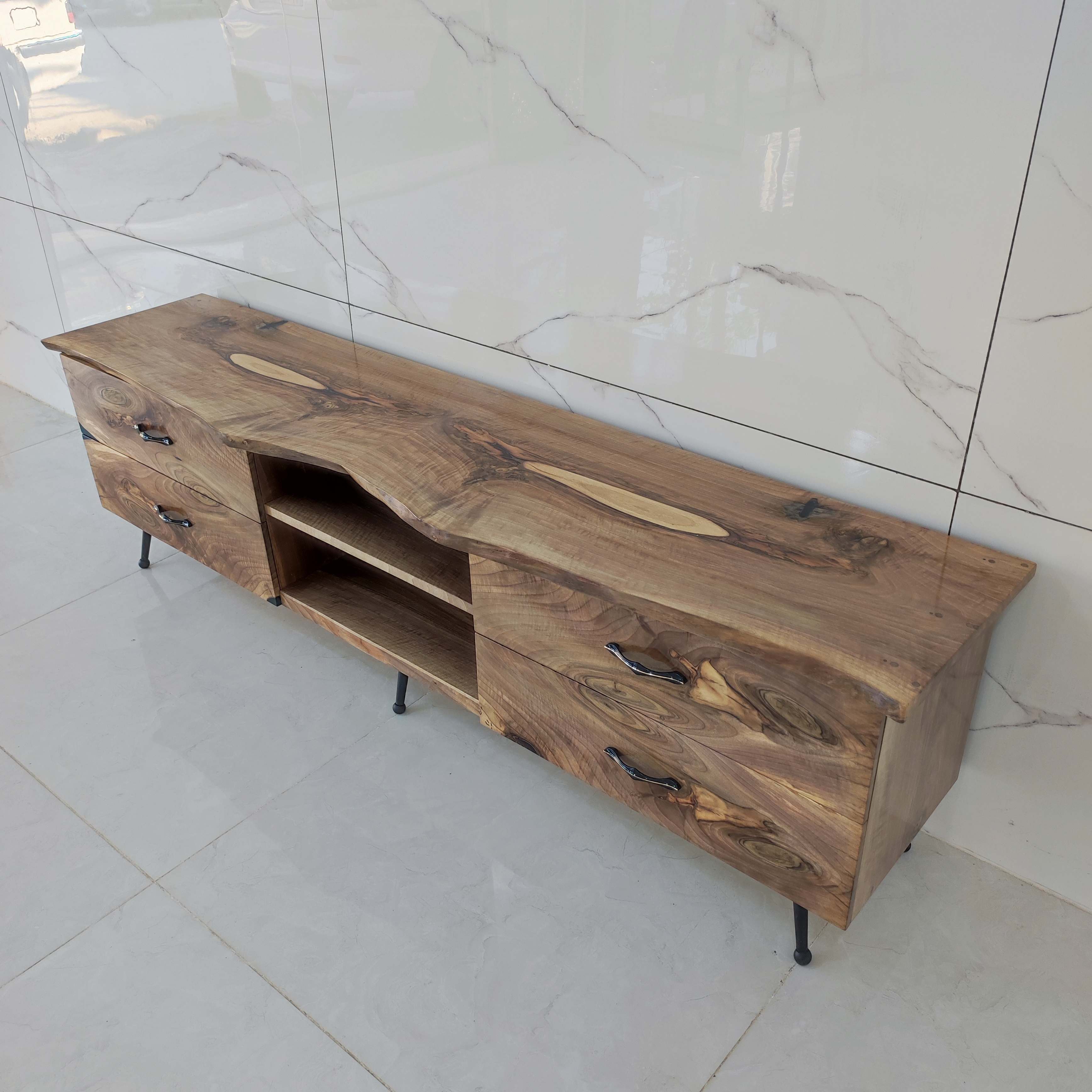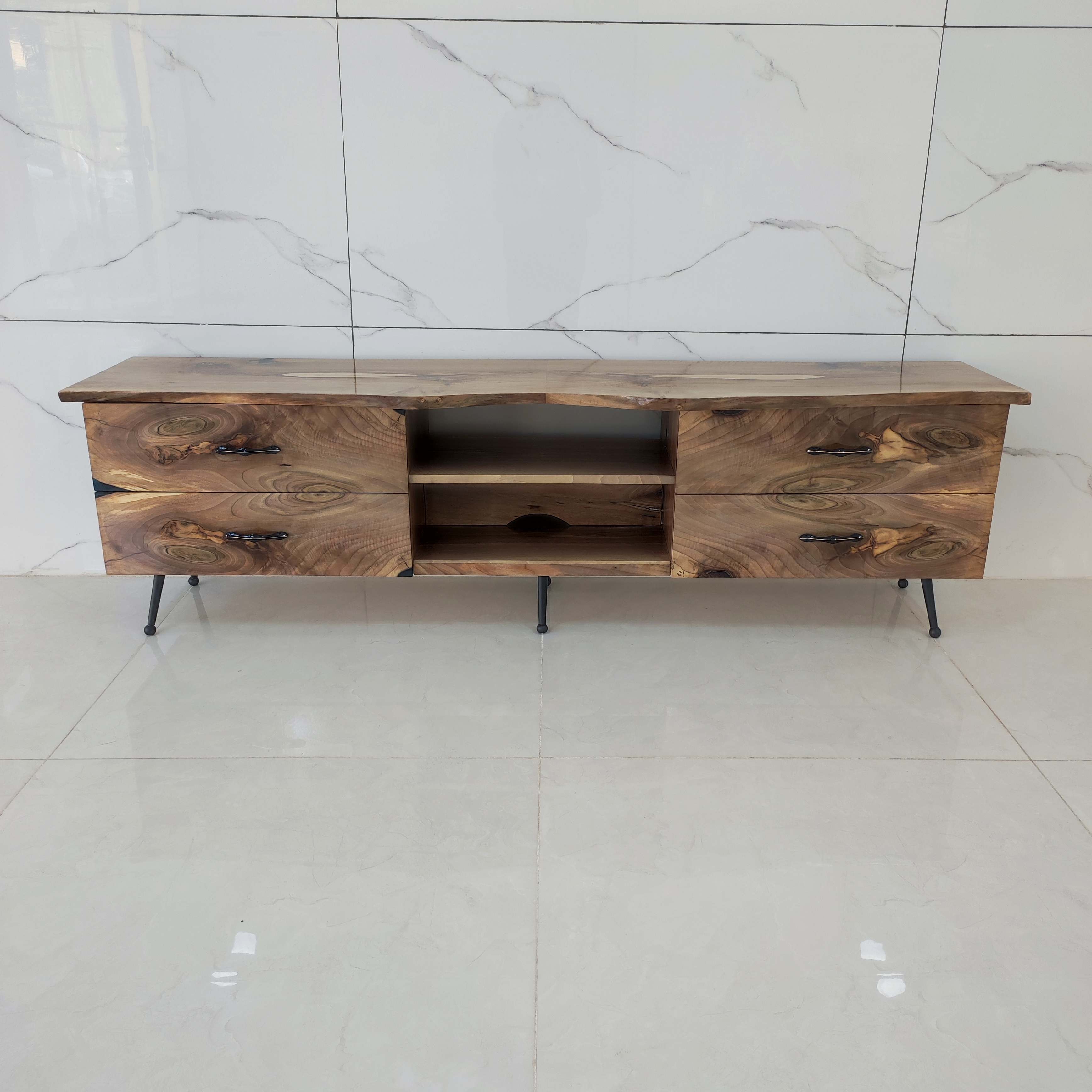 این میز tv خاص تماماً از چوب طبیعی گردو ساخته شده است و طول آن ۱۹۰ سانتی متر و عرض ۴۵ سانت با ارتفاع ۵۵ سانت مناسب خونه های با سبک روستیک و کلاسیک ، دارای چهار عدد کشو با درب آرام بند و فضای بزرگ و مناسب برای سایر لوازم جانبی.